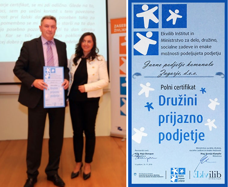 Potem, ko smo v maju 2015 pridobili osnovni certifikat Družini prijazno podjetje in uvedli 11 ukrepov, je v mesecu juliju 2018 revizorski svet Inštituta EKVILIB iz Ljubljane podal pozitivno mnenje glede plana implementacije za ohranitev polnega certifikata. K enajstim, že sprejetim ukrepom, smo dodali še tri nove. V podjetju se tako izvajajo naslednji ukrepi: